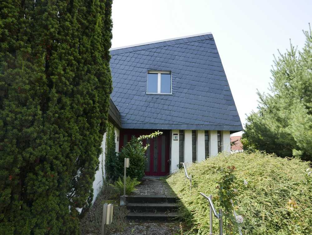 2-geschossiges Einfamilienhaus, vollunterkellert, Baujahr 1970, Fassade in markanter Optik mit grauer Kunstschiefer-Dacheindeckung, weißem Rau-putz und dunkelroter Eingangstüre, langer Treppenaufgang mit Waschbetonplatten und Edelstahl-Handlauf, Grundstück schön eingewachsen, die Garage ist baulich im Haus integriert, 2 Außenstellplätze befinden sich vor dem Anwesen.