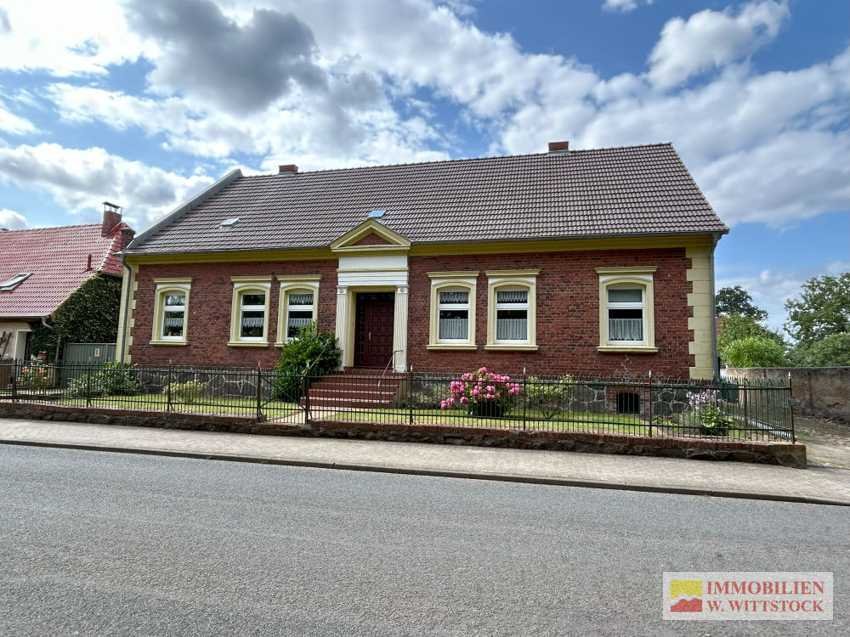 Auf einem großzügigen Grundstück von 2.710 m² erstreckt sich das massive Backsteingebäude mit Feldsteinfundament. Das Haus ist zu ca. 15 % unterkellert. Das Satteldach wurde im Jahr 2000 neu mit Tondachziegeln gedeckt. Die isolierverglasten Kunststofffenster wurden 1991 eingebaut.
