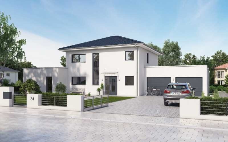 Beim Mehrgenerationenhaus Vivaro trifft eine exklusive Stadtvilla auf moderne Bauhaus-Architektur. Die Stadtvilla verfügt über vier Zimmer auf rund 165 Quadratmetern. Bereits in der Diele haben Sie durch eine Glastür Blick in den offenen Wohn-und Essbereich mit Küche. Vom Wohn- und Esszimmer können Sie über bodentiefe Fenster hinaus in den Garten gehen und sitzen dank überdachter Terrasse auch bei Regen trocken. Der Hauswirtschaftsraum bietet einen direkten Zugang in die Doppelgarage. Im Obergeschoss befinden sich ein Kinderzimmer, ein Elternschlafzimmer mit Ankleide, das ebenso wie das Kinderzimmer einen Zugang auf den Balkon hat, ein Home-Office und ein Badezimmer. Zum Mehrgenerationenhaus wird die Stadtvilla Vivaro durch seine moderne Einliegerwohnung als Anbau im Bauhausstil. Diese verfügt über einen großzügigen Wohn- und Essbereich, ein Badezimmer sowie ein Schlafzimmer.