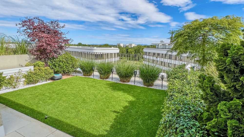Das Highlight ist eine private Dachterrasse mit echtem Dachgarten (ca. 59 m²) – Ihr besonders ruhiger Rückzugsort mit atemberaubendem Alpenblick, Lounge, echtem Golfrasen, überdachtem BBQ-Bereich, Essbereich (6 Personen) und hochwertiger Bepflanzung (z. B. japanischer Ahorn und Palme).