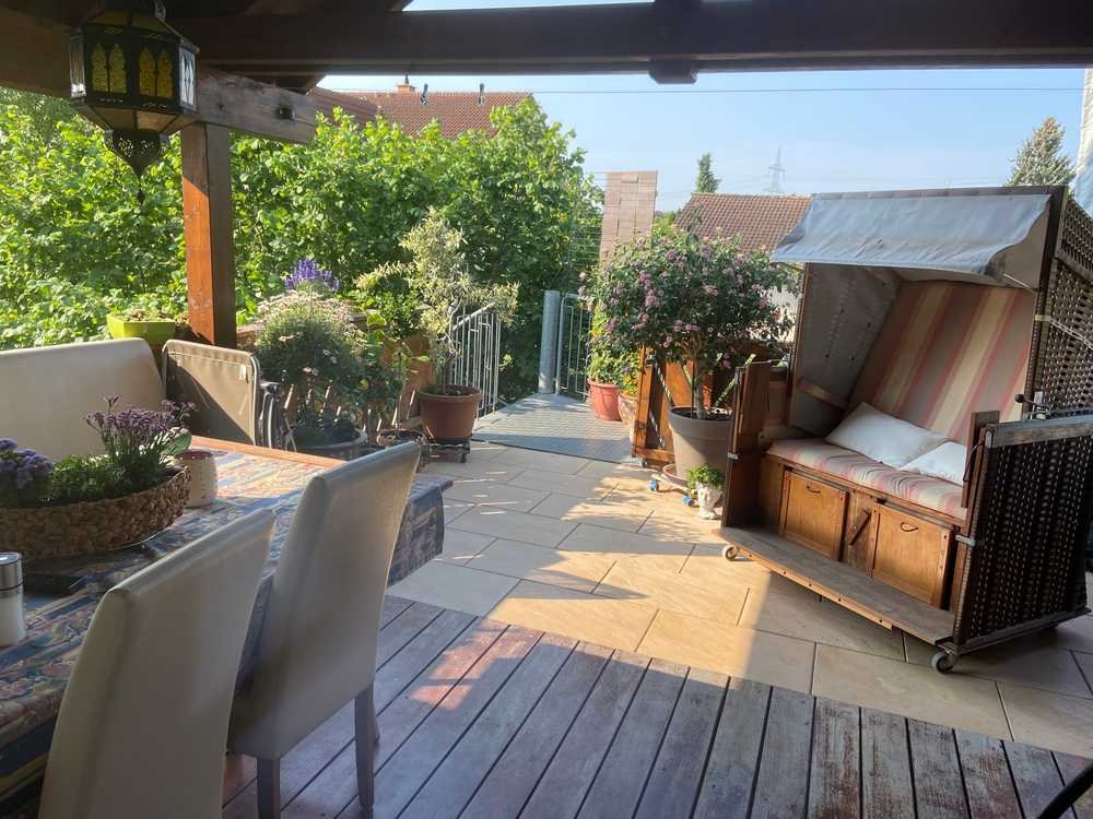 Auf dem großen Balkon spüren Sie die milde Luft, die hier oben immer einen Hauch von Urlaub mitbringt. Eine Außentreppe führt direkt hinunter in den privaten Garten – grüner Rückzugsort, Sonnendeck, Spielfläche, alles zugleich.