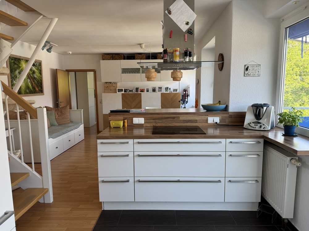 Diese helle und geräumige 5-Zimmer Maisonette-Wohnung hat eine berechnete Wohnfläche von ca. 134 m², wirkt durch die höhere Grundfläche unter den Dachschrägen aber deutlich größer. Die Fläche verteilt sich auf drei Ebenen, die über eine zentrale, offene Treppe verbunden sind. In der untersten Ebene finden sich ein Bad mit Badewanne und Fenster, die große Wohnküche sowie ein weiteres Zimmer, das als Arbeits- und Gästezimmer genutzt wird.