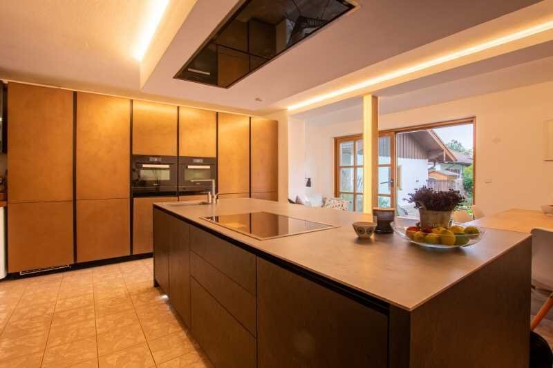Im Erdgeschoss verschmelzen Kochen und Essen zu einem offenen, lebendigen Raum. Die hochwertige Seiko-Küche ist das Herzstück – ausgestattet mit Geräten von Miele und Gaggenau und allem, was anspruchsvolles Kochen braucht: Dampfgarer, Vakuumiergerät, Wärmeschublade, großer Kühlschrank und eine großzügige Kochinsel.