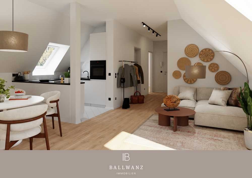 Die Wohnung selbst bietet auf ca. 64 m² eine freundliche, helle Atmosphäre mit Dachschrägen und Raumhöhen bis zu 3,50 m. Der Wohn- und Essbereich führt direkt auf den sonnigen Südbalkon mit herrlichem Blick über Dächer und in die Baumkronen. Ein Tageslichtbad rundet das attraktive Gesamtbild ab.