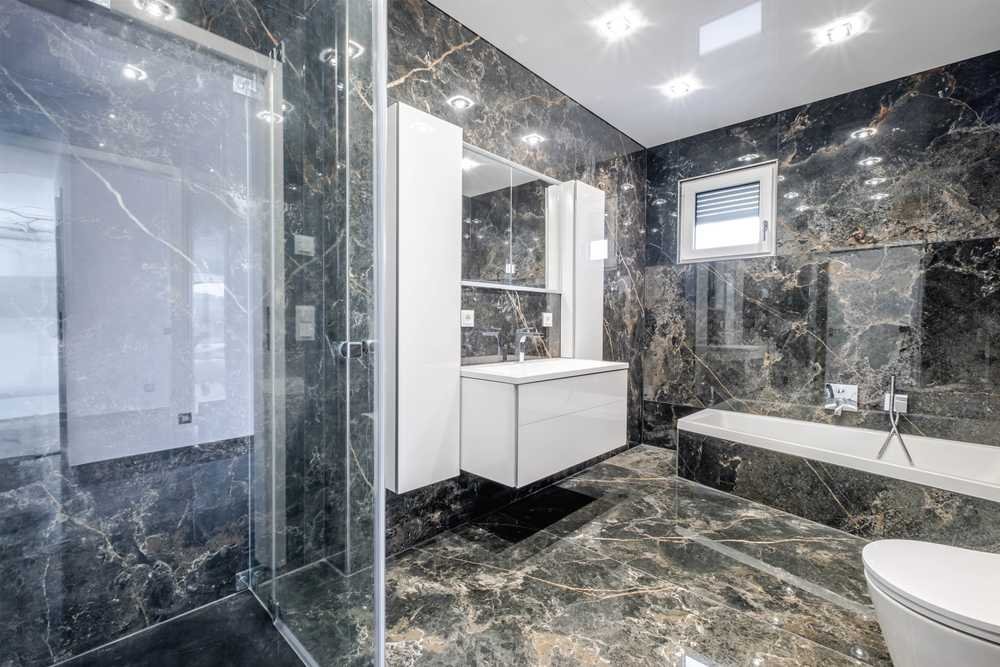 Die Natursteinfliesen im Format 260x120 cm in den Wohn-, Ess- und Kochbereichen sowie in den Badezimmern sorgen für ein exklusives und modernes Raumgefühl.