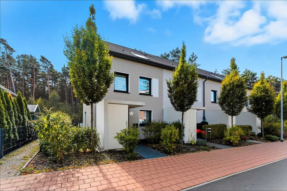 Die Grundstücksfläche umfasst circa 400 Quadratmeter, die Wohnfläche etwa ca. 120 Quadratmeter. Das Haus erstreckt sich über drei Etagen – Erd- und Obergeschoss sowie ein Dachgeschoss – wodurch sich helle, großzügige Räume ergeben. Im Erdgeschoss eröffnen sich ein Wohnbereich mit offener Küche sowie direktem Zugang zur Terrasse, von der aus man einen Blick auf den großen Garten und den angrenzenden Wald hat. Drei Schlafzimmer bieten ausreichend Platz für Familie und Gäste, während zwei Bäder, eines im 1. Obergeschoss und ein weiteres im Dachgeschoss zusätzlichen Komfort bieten. Die Terrassentür ermöglicht direkten Zugang zum ruhigen Gartenbereich, der individuell genutzt werden kann und zu entspannten Stunden im Freien einlädt. Eine neuwertige Einbauküche ist im Preis enthalten. Zwei PKW-Stellplätze gehören zum Haus.
