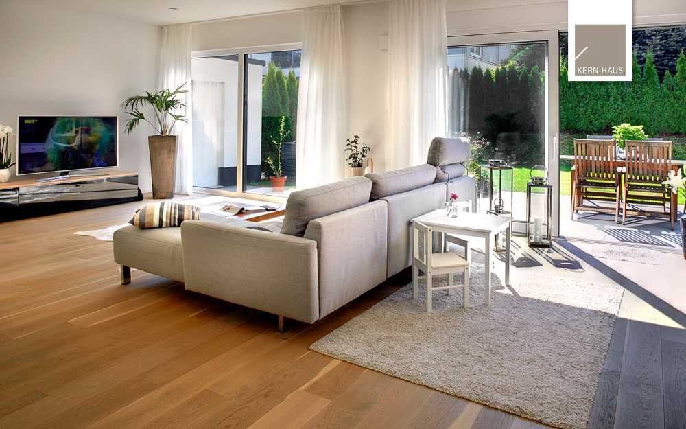 Das Massivhaus Trend ist modern und zeitlos zugleich. Die Architektursprache des Familienhauses ist klassisch, kombiniert mit der modernen Grundrissgestaltung im Innenraum. Das Erdgeschoss folgt dem Trend der Offenheit. Es gleicht mit der Kombination aus Wohnen, Essen und Küche einem Loftcharakter. Im Erdgeschoss befinden sich außerdem der Hauswirtschaftsraum und ein Gäste-WC. Alle Räume sind von der Diele aus erreichbar.