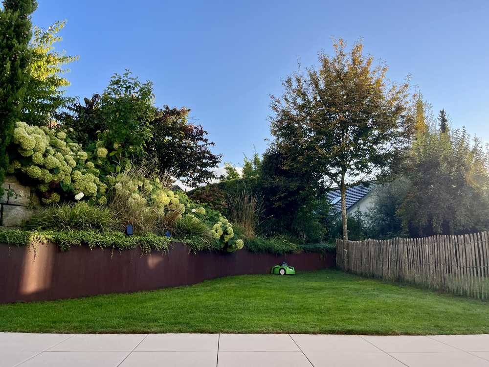 Die weitläufige Terrasse mit gepflegtem Garten bietet eine grüne Oase – ideal zum Entspannen oder für gesellige Stunden im Freien.