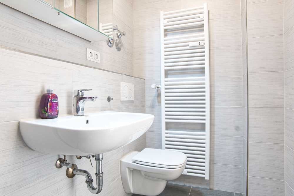 -Modernes Badezimmer mit begehbarer Dusche und Handtuchheizkörper