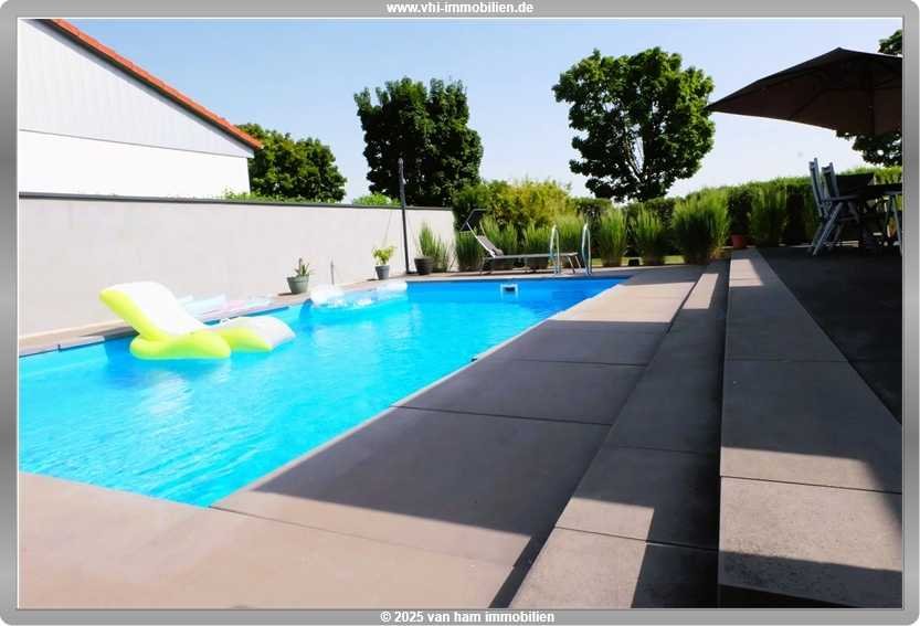 Vom Essbereich aus gelangen Sie auf die herrliche Sonnenterrasse am großen Swimmingpool und weiterhin in den Garten! Der herrliche Gartenblick und der Blick auf den Pool garantieren Ihnen pure Entspannung und Freiheitsgefühle. Hier im Erdgeschoss befinden sich zwei Zwischentüren bzw. Durchgänge zu dem Treppenhaus, wo u. a. ein Gäste-WC mit Tageslicht vorhanden ist.