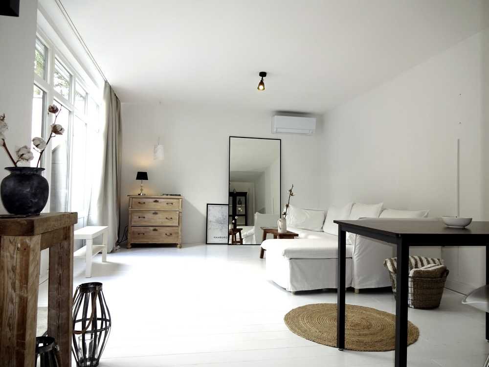 Die Immobilie präsentiert sich nach ihrer Entkernung als hochwertig renoviert und ist bezugsfrei. Sie wurde durch die Designerin und Fotografin Mina Hesse gestylt und ausgestattet und wird möbliert verkauft. Die Fußböden in der gesamten Wohnung wurden neu ausgegossen und mit weiß lackierten Dielen aus Kiefernholz versehen. Das Bad wurde 2024 saniert, die Sanitärobjekte durch neue ersetzt und im Bereich der Dusche neu gefliest. Unter dem Waschtisch ist Platz für eine Waschmaschine.