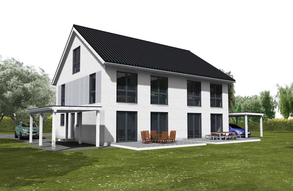 Ein Hingucker. Das ist unser massives Doppelhaus mit Satteldach auf alle Fälle. Denn an den klaren und symmetrischen Formen erfreut sich jedes Auge. Dann ist da die Größe, die keine Wünsche offen lässt – insgesamt 150 m2 Wohnfläche und vier Zimmer finden unter dem Dach Platz. Genügend Raum also zum Kochen, Schlafen, Lachen, Leben und für viele Familienmomente, die sich ins Herz einbrennen. Gästezimmer oder Homeoffice. Speziell in den warmen Monaten werden Sie die Terrasse lieben. Gemeinsames Wohnen und genügend Privatsphäre müssen sich keineswegs ausschließen.