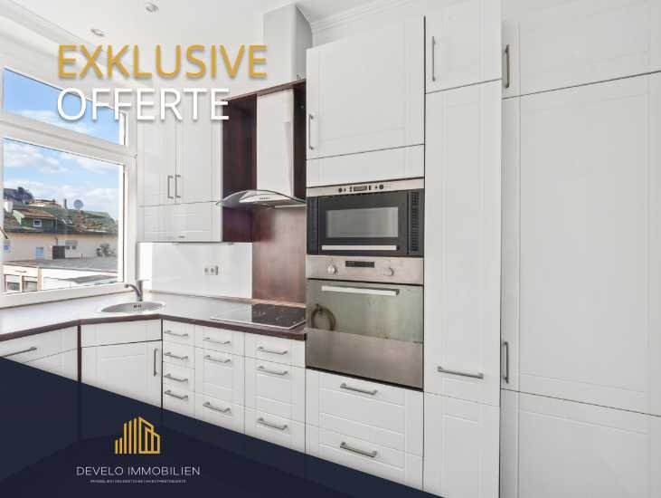 Die separate Küche überzeugt mit einer Einbauküche in klassischem Weiß, reichlich Stauraum und integrierten Geräten – inklusive Kochfeld, Backofen, Dunstabzug und Hochbau-Mikrowelle. Das Fenster bringt Tageslicht an den Arbeitsplatz und öffnet den Blick über die gewachsene Nachbarschaft.