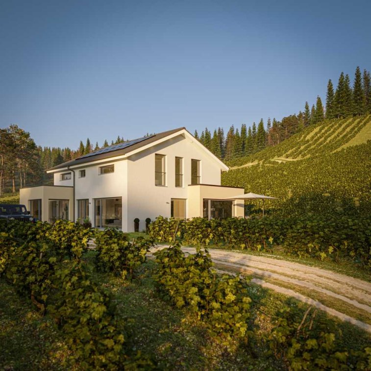 Eine junge Architektursprache, eine innovative Raumaufteilung mit maximaler Flexibilität und jede Menge Komfort: Dieses Einfamilienhaus geht hinsichtlich Gestaltung und Ausstattung keine Kompromisse ein. Von außen zeigt sich der Zweigeschosser als modern interpretiertes Satteldachhaus, das durch attraktive Anbauten und Erweiterungen akzentuiert wird. So fügt sich auf der Eingangsseite ein Übereck-Erker an, der sich in eine praktische Eingangsüberdachung verlängert. Auf der Gartenseite findet sich ein weiterer Übereck-Erker mit Terrassenüberdachung. Beide wurden in einem sehr natürlich wirkenden Sandton gestaltet, der dem Fertighaus einen freundlichen, einladenden Charakter verleiht. Ein Zwerchgiebel mit Flachdach und großzügige Glasflächen, die die Innenräume in ein sonniges Wohlfühlambiente tauchen, lockern die Ansicht zusätzlich auf. Betreten wird das Haus über eine repräsentative Diele mit geräumigem Garderobenbereich. Rechts und links schließt sich jeweils ein Büro an. Hier können Geschäftspartner oder Kollegen empfangen werden, ohne dass das Familienleben gestört wird. Es ist auch denkbar, die Büros als schicke Jugendzimmer einzurichten. Mit dem angrenzenden Duschbad bieten sie die besten Voraussetzungen für eine alternative Nutzung. Im hinteren Teil des Gebäudes "dreht" sich alles um den Wasserdampfkamin: Stilvoll trennt er die Funktionsbereiche Wohnen, Essen und Kochen voneinander ab. Eine geradläufige Treppe führt die Besucher hinauf in das Obergeschoss, das dank des hohen Kniestocks von 1,80 m dem Erdgeschoss hinsichtlich des Platzangebots in nichts nachsteht. Unter dem flach geneigten Dach liegen zwei Kinderzimmer, ein großer Schlafraum mit angeschlossener Ankleide und Zugang zum sonnenverwöhnten Balkon sowie zwei Wellnessbäder, die durch einen großen ebenerdigen Duschbereich miteinander verbunden sind. Eine wohlverdiente Auszeit vom Alltagsgeschehen verspricht aber nicht nur die Regendusche. Auch die prominent vor dem bodentiefen Fenster platzierte Wanne und die Infrarotkabine laden zum Entspannen ein. Die komplette Technik wurde im Musterhaus in den Keller ausgelagert, sodass den Bauherren bei der Gestaltung der oberen Etagen alle Möglichkeiten offenstehen. Ohne Keller bietet sich eines der Büros im Erdgeschoss dafür an.