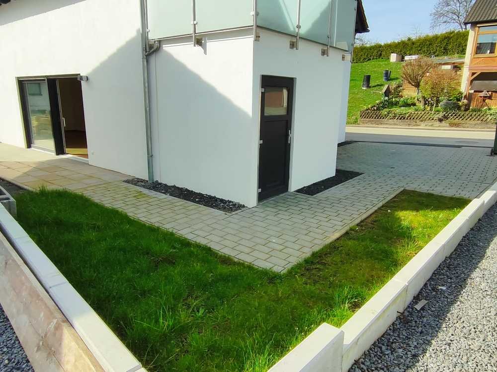 Die Außenanlage mit Terrasse, geplasterete Einfahrt sowie zwei Parkplätze ist bereits fertiggestellt.