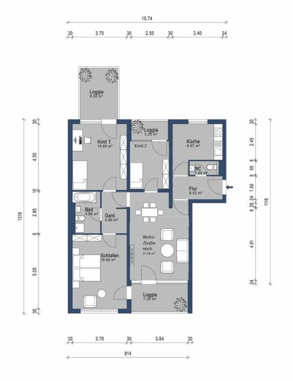 Über die Treppe oder mit dem Lift erreichen Sie die Wohnungseingangstür. Empfangen werden Sie in einer geräumigen Diele mit Garderobe und Gäste-WC. An die Diele schließt sich der Wohn-/Essbereich an, der wiederum mit der Küche und zwei Loggien nach Süd/Westen und nach Osten verbunden ist. Der Wohn-/Essbereich (ca.32 m²) ist das Herzstück und Mittelpunkt der Wohnung lässt sich individuell nach ihren persönlichen Wünschen gestalten und anpassen. Die Küche mit Fenster verfügt über ca. 9 m² und Platz für eine vollausgestattete, moderne (Wohn-) Küche. Der zweite Teil der Wohnung liegt etwas abgelegener und ruhig, durch einen Flur verbunden auf der anderen Seite. Der Bereich verfügt über zwei Schlafzimmer 1 (nord-östlich gelegen) hat eine über ca. 9 m² große Loggia mit Verglasung und zeichnet sich als einer der Highlights der Immobilie aus. Insgesamt beträgt die Wohnfläche ca. 104 m², die reine Außenfläche der Loggien betragen fast 20 m²(und sind nur 1/2 angerechnet). Zur Wohnung gehört ein PKW-Außenstellplatz auf dem Parkplatz neben der Wohnanlage.