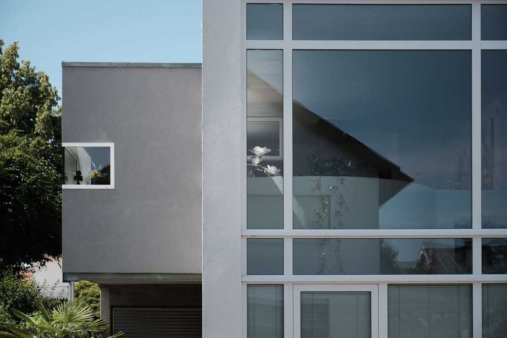 Der Haupteingang führt in einen großzügigen Eingangsbereich mit rund 16 qm Fläche, der sich über einen Luftraum nach oben öffnet. Die darüberliegende Galerie schafft eine offene Verbindung zum Essbereich im Obergeschoss und sorgt für viel Licht und eine angenehme Atmosphäre bereits beim Betreten des Hauses. Ein separates Gäste-WC befindet sich ebenfalls auf dieser Ebene. Die gesamte Immobilie – mit Ausnahme des Ateliers – ist durchgehend mit hellen Bodenfliesen ausgestattet.