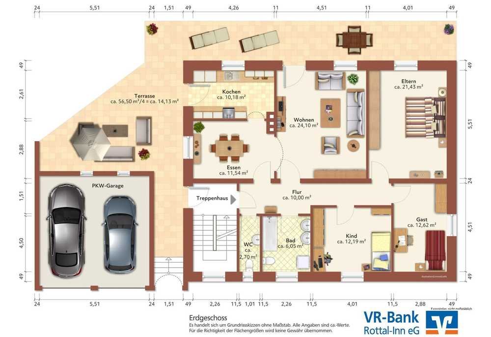 Das Mehrfamilienhaus mit Doppelgarage liegt sehr ruhig (Raiffeisenstr. 6) in einem Wohngebiet am Ende einer Sackgasse mit Wendeplatz. Es befindet sich zum Großteil im Originalzustand aus dem Baujahr 1981/82 und weist einen gewissen Renovierungsstau auf. Ein großer Vorteil des Hauses besteht darin, dass es derzeit unbewohnt ist und somit sofort mit Renovierungsmaßnahmen begonnen werden kann und dann eine Eigennutzung, z. B. für mehrere Generationen oder Großfamilien bzw. eine (Teil-)Vermietung möglich ist. Die Grundsubstanz ist solide, beispielsweise wurde das Haus mit 49,5 cm starken Mauerziegeln in Massivbauweise mit Stahlbetondecken erstellt. Die beiden Wohnungen im Erd- und Obergeschoß mit je ca. 111 m² Wfl. (ohne Einrechnung von Terrasse und Balkon) bieten genug Platz für Familien und das nachträglich ausgebaute Dachgeschoß (ca. 66 m²) mit weiteren zwei Zimmern plus Essküche und Bad bietet zusätzlich viel Wohnraum. Ein ebenfalls nachträglich ausgebauter beheizter Raum (ca. 15 m²) über den Garagen kann separat genutzt werden.