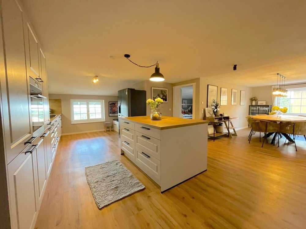 Der großzügige Wohn- und Essbereich ist offen gestaltet und mit einer neuwertigen Markenküche ausgestattet, die bereits im Kaufpreis enthalten ist. Farblich abgestimmte Wände und klare Linien verleihen der Wohnung einen modernen, ruhigen Charakter. Ein zusätzliches Gästebad sorgt für Komfort im Alltag.