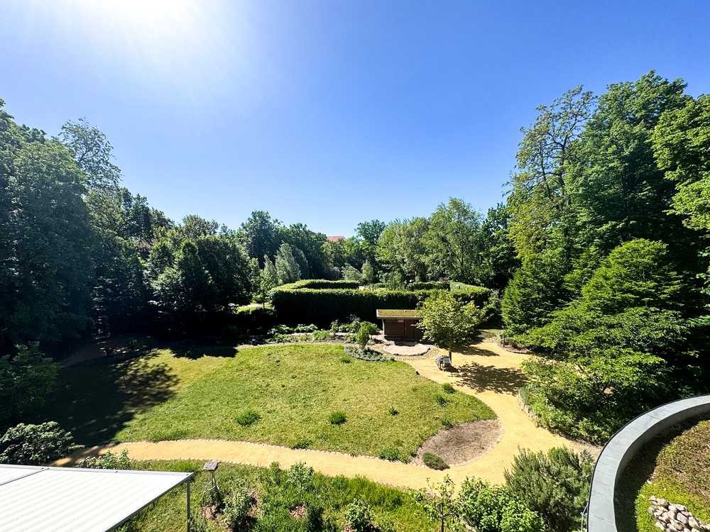 Das Gebäude steht auf einem großen Grundstück mit 3800 m², dessen Freifläche allen Bewohnern einen großen Garten mit Rasenflächen und Sitzgelegenheiten bietet. Zudem hat das Gebäude einen großen Fahrradkeller, der sehr bequem über eine Auffahrt zu erreichen ist. Mit dem Aufzug kann man aus dem Keller bzw. Untergeschoss in die Wohnung fahren.