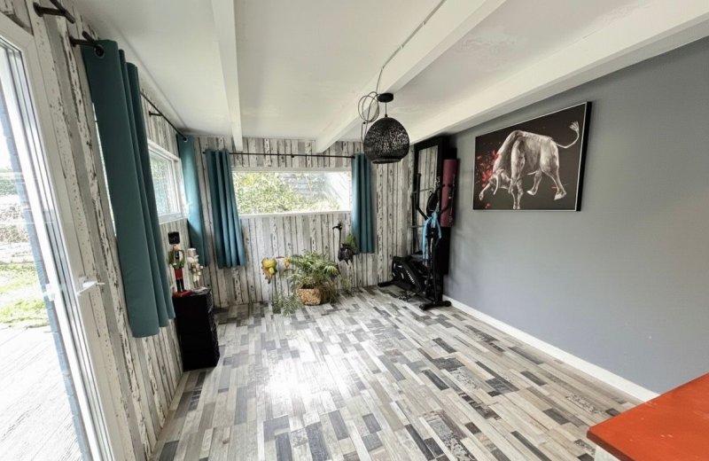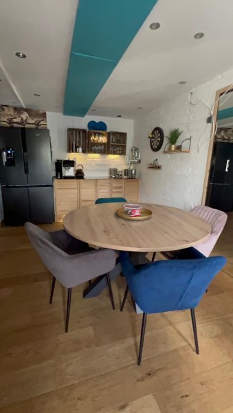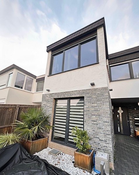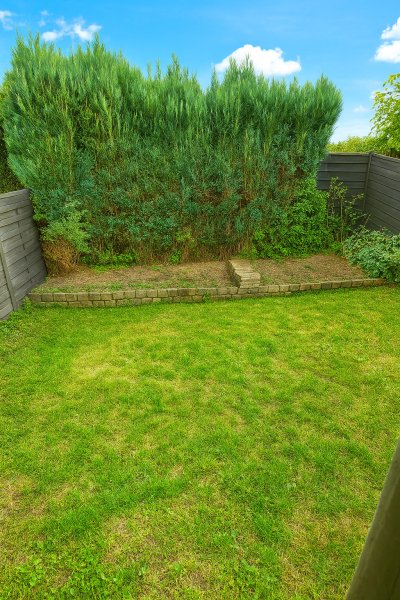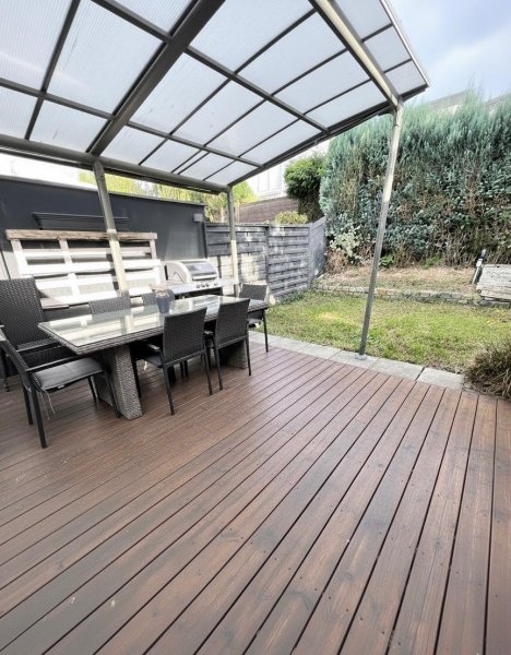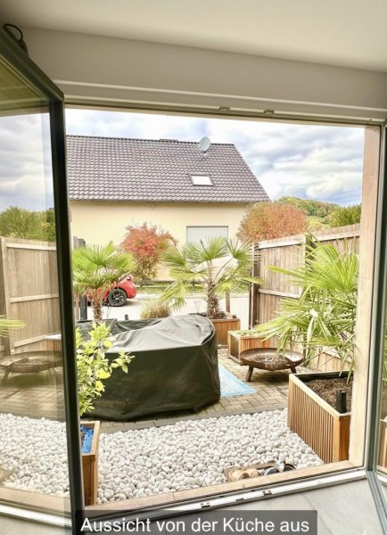 Die neue Haustür führt vom Flur in ein helles Esszimmer und eine offene Küche mit direktem Zugang zur Terrasse. Über das Wohnzimmer gelangt man in den gepflegten Garten – ideal, um sonnige Tage im Freien zu genießen. Der Garten ist direkt ans Haus angeschlossen und bequem erreichbar.