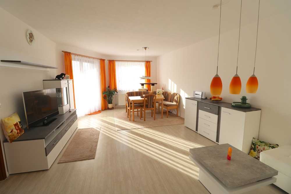 - Helles Wohn-/Esszimmer mit Zugang zum großen, überdachten Balkon
