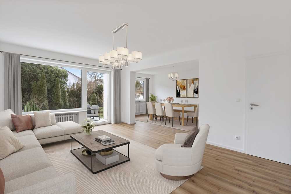 Wohn-/Essbereich - ein lichtdurchfluteter Wohnraum mit einem angenehmen Wohngefühl und Zugang zur sonnigen Süd-Terrasse für gesellige Grillabende mit Freunden und in den Garten, in dem sich Ihre Kinder austoben können.