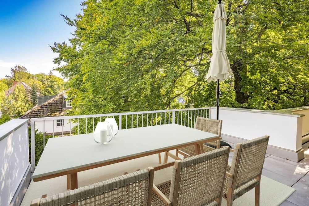 Die Räumlichkeiten verteilen sich über ca. 54 m² und zeichnen sich durch einen hervorragend gegliederten Grundriss aus. Ein großzügiger Wohn-/Essbereich mit benachbarter Küche, ein Schlafzimmer, ein helles Bad und eine Diele mit praktischer Abstellnische bilden das Raumangebot. Ein besonderes Highlight ist die Dachterrasse mit sonniger Süd-Ost-Ausrichtung und traumhaftem Blick in üppigen Baumbestand.