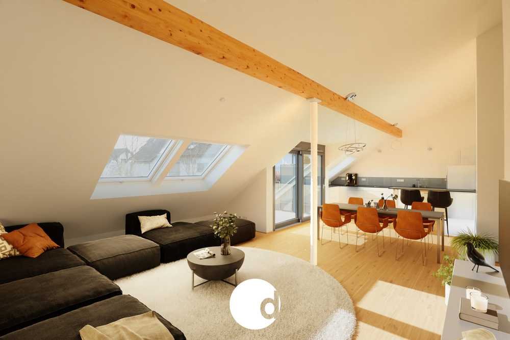 Die Wohnung verfügt über einen ca. 35 m² großen, lichtdurchfluteten Wohn- und Essbereich mit Zugang zur außergewöhnlich großen, nach Süden ausgerichteten, Dachterrasse mit traumhaftem Blick ins Grüne. In diesem sonnenverwöhnten Teil der modernen Wohnung, befindet sich auch die exklusive Einbauküche samt allen elektrischen Geräten.