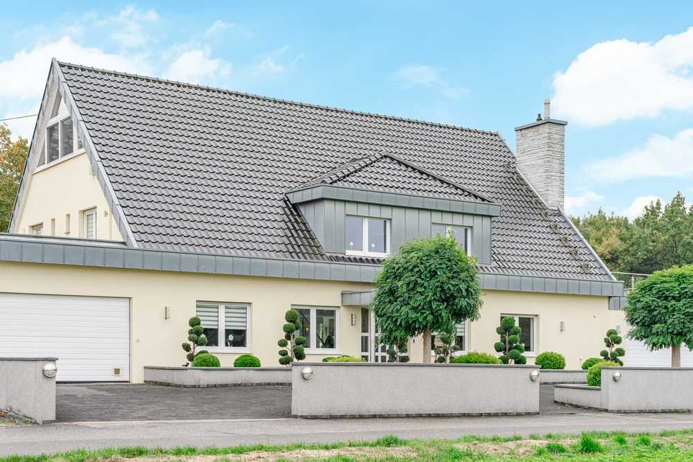Über eine großzügige Auffahrt gelangen Sie und Ihre Gäste zu einer beeindruckenden Wohnimmobilie mit einer sehr klassischen und dennoch modernen Fassade. Das Haus hat eine symmetrische Gliederung, die beiden großen Garagen links und rechts neben dem Haus vervollständigen das harmonische Bild.