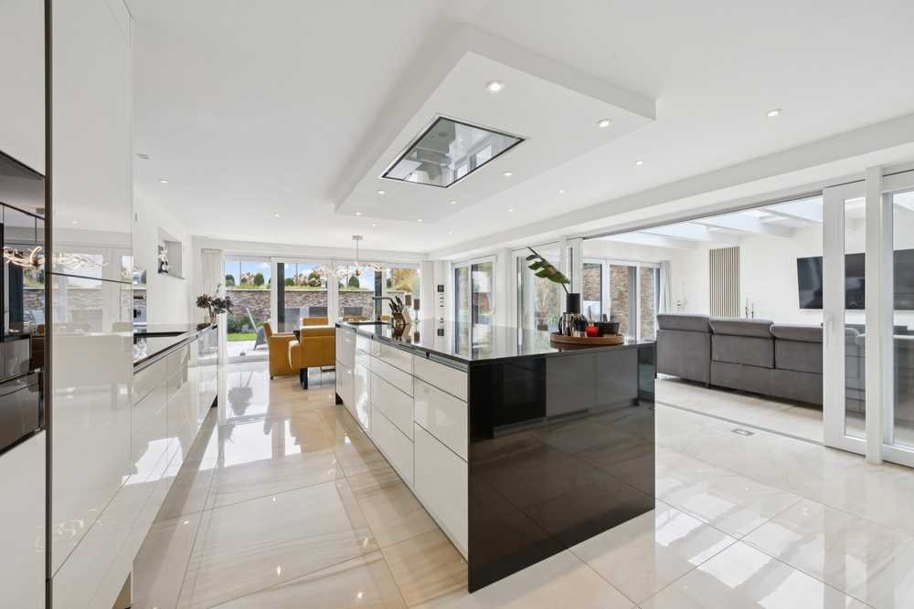 Das offene Raumkonzept verbindet Wohnen, Essen und Kochen auf stilvolle Weise: Die moderne Küche mit zentralem Kochfeld bildet das Herzstück des Hauses und lädt zum gemeinsamen Kochen und Verweilen ein.
