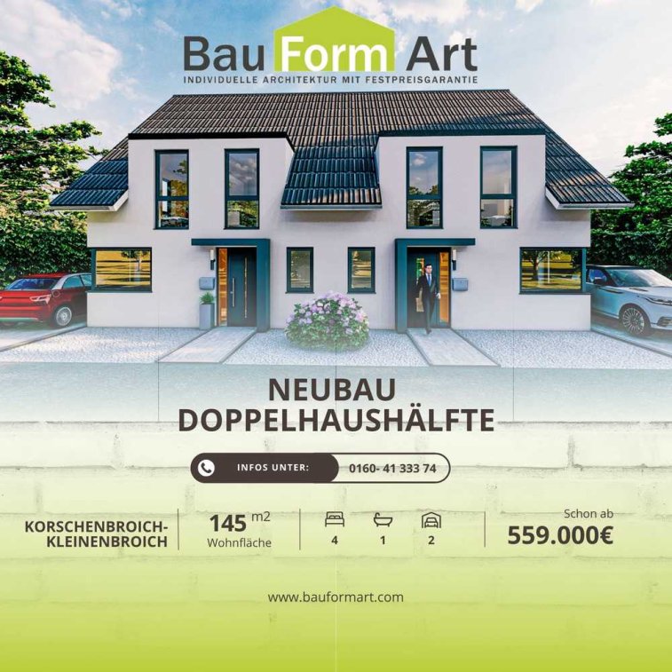In diesem Angebot bieten wir Ihnen eine moderne, individuell planbare Doppelhaushälfte mit großem Süd-West Grundstück (ca. 396m2 bzw. 429m2) in Korschenbroich-Kleinenbroich an (gewachsene & ruhige Wohnlage). Das Haus an sich ist lediglich ein Vorschlag und wird an Ihre individuellen Wünsche angepasst. Vorgesehen ist zunächst eine Wohnfläche von ca. 145m2, welche sich auf Wunsch noch anpassen lässt. Das entstehende Traumhaus wird in solider Bauqualität innerhalb von nur elf Monaten durch hoch qualifizierte, regionale Handwerksbetriebe erbaut und erfüllt durch die integrierte Luftwassserwärme-Pumpe selbstverständlich die aktuellsten Energienormen. So können Sie auf ein exzellentes Design und günstige Nebenkosten setzen, ohne Abstriche an Komfort machen zu müssen oder die Umwelt unnötig zu belasten.