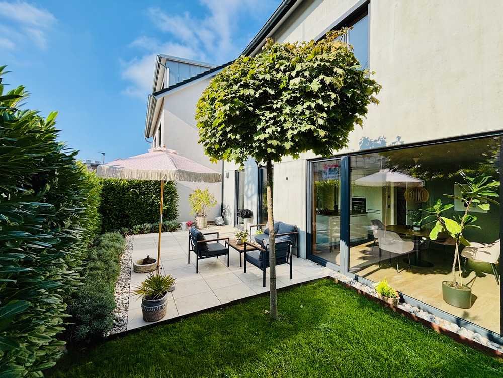 Spielt sich das Leben nicht immer in der Küche ab? Die offene hochwertige Einbauküche mit Markenelektrogeräten aus den Häusern Bosch und Bora lädt zu gemeinsamen Kochstunden ein. Die Kochinsel stellt den Übergang der Küche zum lichterfüllten Essbereich her. Die nach Süden orientierte Terrasse verbindet den Innenraum mit dem Garten. Ein praktischer Hauswirtschaftsraum grenzt direkt an die Küche an und ist nahezu versteckt über eine Schiebetüre erschlossen. Ein separates WC ist im Eingangsbereich situiert. Ein weiteres Zimmer mit Zugang zur Westterrasse erfüllt die Funktion eines Büros oder alternativ eines Wohnzimmers – das sich aktuell im Dachgeschoss mit angrenzender Dachterrasse mit See- und Bergblick befindet.