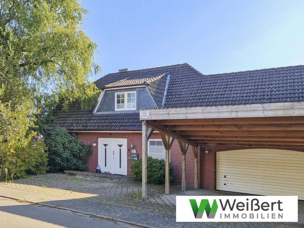 Das Grundstück ist durch Hecken und Sträucher eingefriedet und bietet angenehme Privatsphäre. Der Garten ist pflegeleicht angelegt, mit Rasenflächen, einem kleinen Teich und gewachsenem Baumbestand, der dem Außenbereich eine idyllische Atmosphäre verleiht. Die große Terrasse lädt zu entspannten Stunden im Freien ein. Vom Garten aus gelangen Sie direkt in die Doppelgarage, die Platz für zwei Fahrzeuge bietet und mit einem Wallbox-Anschluss ausgestattet ist. Vor der Garage befindet sich ein überdachter Doppelcarport, der zusätzlichen Stellraum bietet.