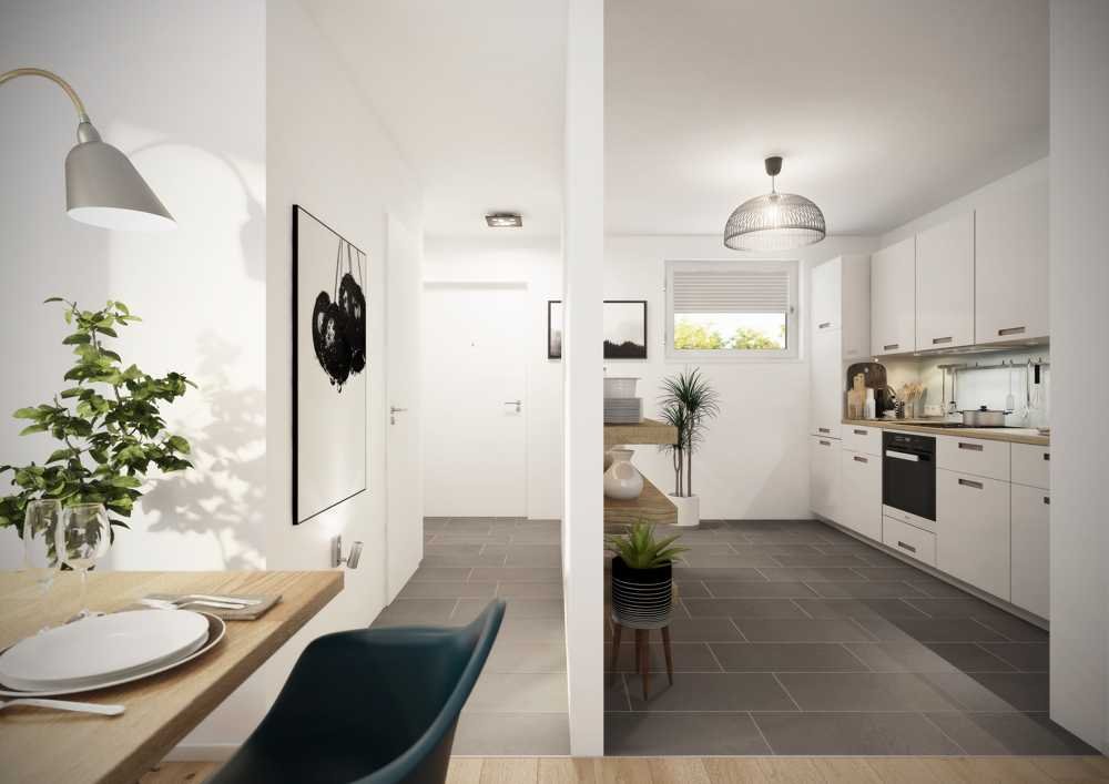 Im Erdgeschoss empfängt Sie ein großzügiger Wohn- und Essbereich mit offener Küche, der durch große Fensterflächen viel Tageslicht und eine freundliche Atmosphäre bietet. Ein Gäste-WC sowie ein einladender Eingangsbereich runden diese Ebene ab.
