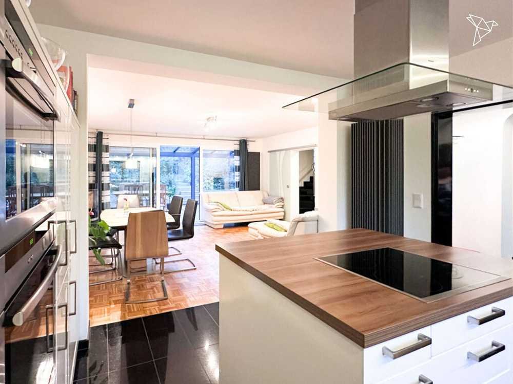 Die linke Haushälfte, erbaut im Jahr 1977, wurde in den vergangenen Jahren umfassend modernisiert und präsentiert sich in zeitgemäßem, sehr gepflegtem Zustand. Auf rund 100 m² Wohnfläche zuzüglich eines großzügigen Wintergartens mit etwa 29 m² überzeugt sie durch ein harmonisches Raumgefühl und eine durchdachte Gestaltung. Der Eingangsbereich öffnet sich zu einem lichtdurchfluteten Wohn- und Essbereich mit Design-Kaminofen und bodentiefen Schiebetüren, die den Blick in den liebevoll angelegten Garten freigeben. Die elegante Küche in Magnolienweiß mit Kochinsel und hochwertigen Geräten fügt sich perfekt in das offene Konzept ein und bietet freien Blick in die Natur.