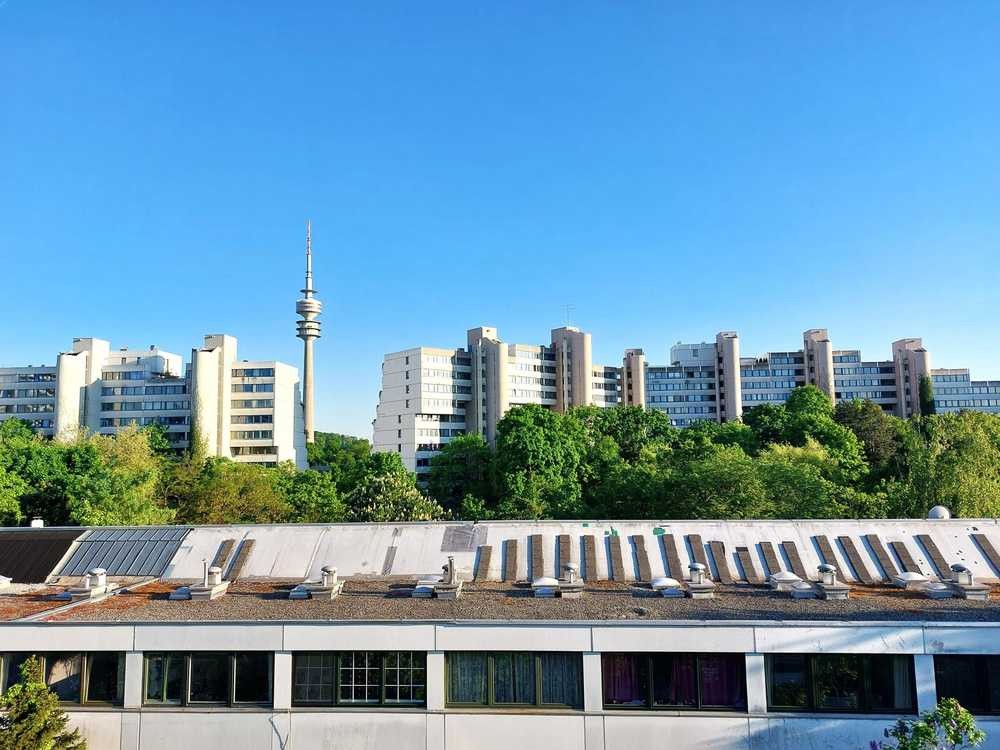 Die obere Etage überzeugt durch ein geräumiges Schlafzimmer, ein weiteres Zimmer, das sich hervorragend als Arbeits- oder Kinderzimmer eignet, sowie ein elegantes Badezimmer. Das Highlight bildet die überdachte Dachterrasse mit einzigartigem Blick auf den Olympiaturm – ein Rückzugsort auf höchstem Niveau. Das denkmalgeschützte Gebäude besticht durch seine einzigartige Architektur und seinen futuristischen Flair, der sich in das Gesamtkonzept Olympiadorf & Park einfügt.