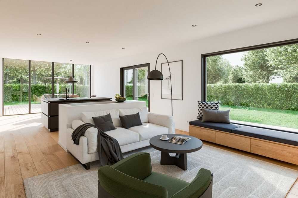 Entdecken Sie die Möglichkeiten, Ihr Traumhaus als Bungalow mit einem Satteldach zu realisieren und erleben Sie eine zeitgemäße Architektur gepaart mit einem einzigartigen Raumkonzept. Der Wohn-/Ess- und Kochbereich erstreckt sich über großzügige 44 m² und bietet höchsten Komfort. Eine halbhohe Wand, die optional auch raumhoch sein kann, trennt geschickt den Koch- vom Wohnbereich und schafft so eine harmonische Balance zwischen gemeinsamen Beisammensein und klarer Struktur. Große Panoramafenster sowie eine geräumige Panorama-Hebeschiebetür sorgen für ein helles und offenes Ambiente, das Innen- und Außenbereich harmonisch miteinander verbindet. Der Schlafbereich überzeugt mit großzügiger Stellfläche für Schränke und einem direkten Zugang zum geräumigen Badezimmer. Ein zusätzlicher Raum, flexibel als Büro, Gäste- oder Hobbyraum nutzbar, sowie ein zweites Badezimmer mit optionaler Dusche, runden das Raumangebot ab. Auf Anfrage kann der Grundriss des Bungalows auch barrierefrei gestaltet werden, um allen individuellen Bedürfnissen gerecht zu werden.