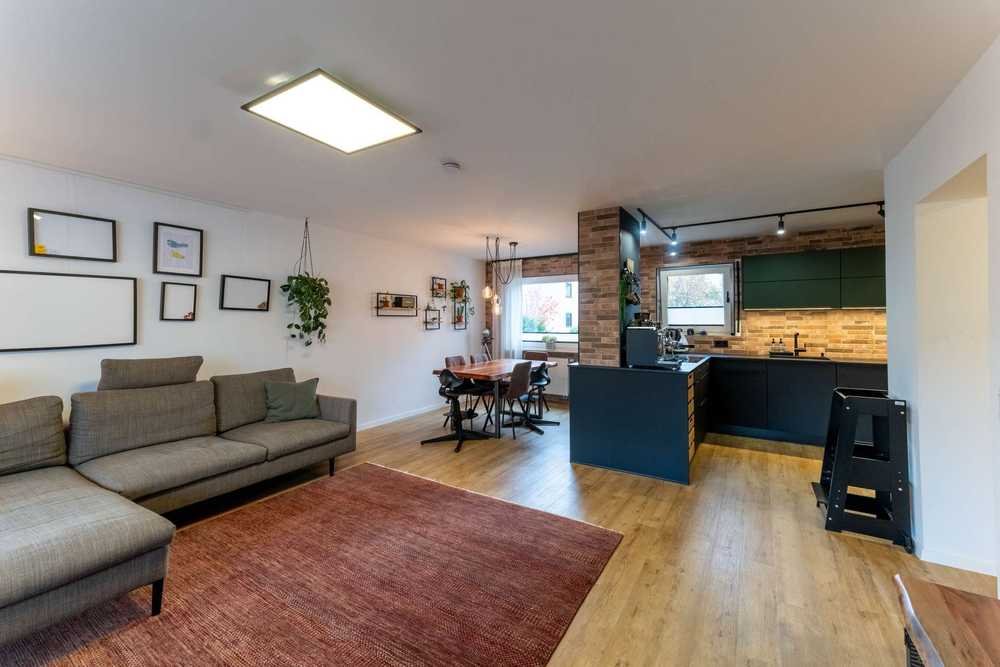 Das Herzstück der Wohnung ist der offene Wohn- und Essbereich, der mit hochwertigem Klebevinylboden und einer harmonischen Raumaufteilung begeistert. Hier lassen sich gemütliche Stunden ebenso genießen wie gesellige Abende mit Familie oder Freunden. Ein echtes Highlight ist die maßgefertigte Einbauküche, die mit ihrem modernen Farbkonzept in Schwarz und Tannengrün sowie Wänden in stilvoller Klinkeroptik einen einzigartigen Charakter verleiht – ein Ort, an dem Kochen zum Erlebnis wird.