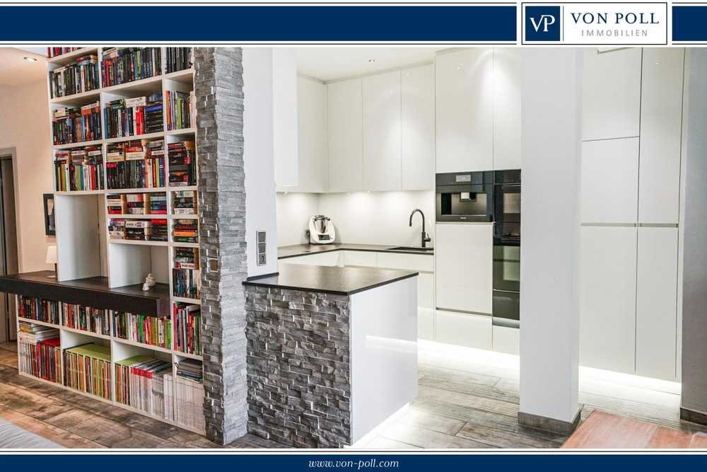 Die maßgefertigte Einbauküche besticht durch Eleganz und hochwertige Technik. Ausgestattet mit einer ausfahrbaren Dunstabzugshaube (Berbel), einem Dampfgarer (Miele), Tellerwärmer (Miele), integrierter Kaffeemaschine (Miele), Backofen (Miele), Spülmaschine (Miele) sowie einem Quooker-Wasserhahn, überzeugt sie mit einem Neupreis von ca. 63.000 €.