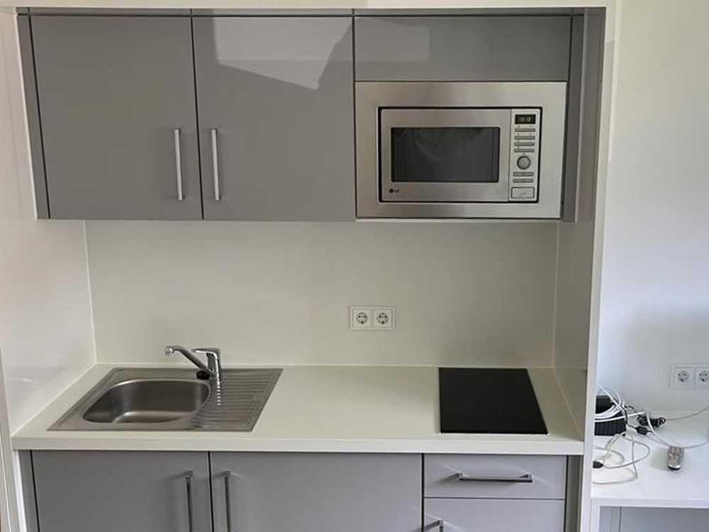 Perfekt! Die Wohnung ist bereits komplett modern möbliert (Küchenzeile, Bett, Schreibtisch, großer Kleiderschrank).