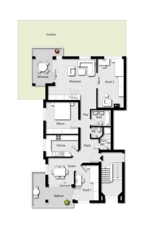 Ein besonderes Highlight stellt der Privatgarten mit Terrasse dar, der über das Wohnzimmer erschlossen wird.