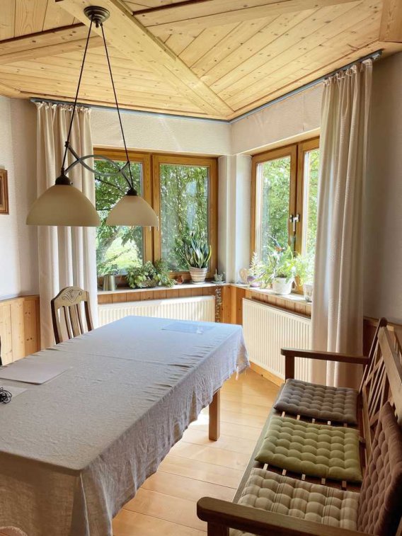 - Wohnzimmer mit Holzofen, Essbereich