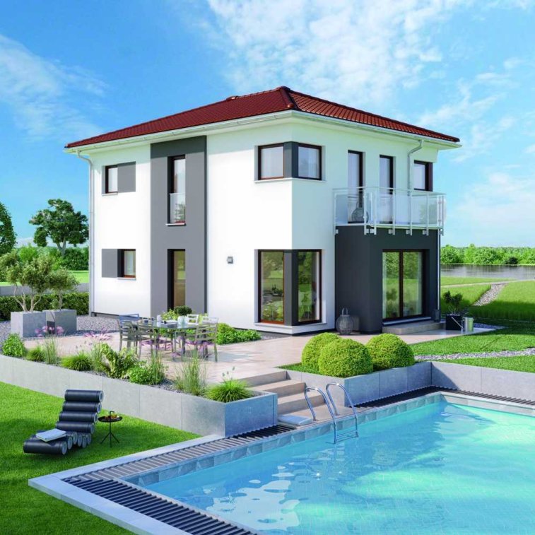 Diese repräsentative Stadtvilla macht nicht nur in begehrten City-Lagen eine gute Figur, sie begeistert auch auf dem Land mit ihrem urbanen Flair. Charakteristisch ist das Walmdach, das den schlichten, quaderförmigen Baukörper krönt. Es strahlt mit seinem klassischen Rotton einen herrschaftlichen Charakter aus und erfüllt gleichzeitig auch praktische Zwecke. So erweist es sich als besonders stabil, langlebig und vor allem pflegeleicht. Zudem ermöglicht es eine uneingeschränkte Nutzung des Obergeschosses ganz ohne störende Schrägen. Dank der zusätzlichen Dachflächen bietet es beste Voraussetzungen für die Installation einer Photovoltaikanlage. Erweitert wird das Fertighaus von einem eleganten Rechteck-Erker, auf dessen Dach ein sonnenverwöhnter Balkon Platz findet. In einem edlen Dungelgrau gehalten setzt er zusammen mit der Fassadenaufdopplung einen spannenden Kontrast zur weiß verputzten Fassade. Selbstverständlich können sich die Bauherren auch für einen anderen Farbton entscheiden. So wird aus dem EDITION 123 ein echtes Unikat, das die Persönlichkeit seiner Bewohner widerspiegelt. Genauso individuell wie das Äußere lässt sich das Innere der Stadtvilla gestalten. Das fängt bereits bei der Aufteilung des Grundrisses an. Dieses Planungsbeispiel ist ausgerichtet auf den Alltag einer vierköpfigen Familie. Empfangen werden Bewohner und Besucher von einer geräumigen Diele. Schon von der Haustür aus fällt der Blick durch den offen angelegten Wohn- und Essbereich bis hinaus in den Garten. Über Eck schließt sich die Küche an das lichtdurchflutete Raumensemble an. Sie besitzt einen eigenen Zugang zur großen Terrasse, sodass Geschirr und Speisen ohne Umwege nach draußen gebracht werden können. Neben den Gemeinschaftsräumen befinden sich im Erdgeschoss noch ein Gäste-WC, ein geräumiges Büro und ein Technik- bzw. Hauswirtschaftsraum. Eine platzsparende halbgewendelte Treppe führt hinauf in das Obergeschoss. Die Wohnfläche teilen sich hier zwei Kinderzimmer, der Elternschlafraum mit integriertem Ankleidebereich sowie ein gemütliches Familienbad, das sich mit einer großen Wanne, einem Doppelwaschtisch und einer bodengleichen Dusche ausstatten lässt.