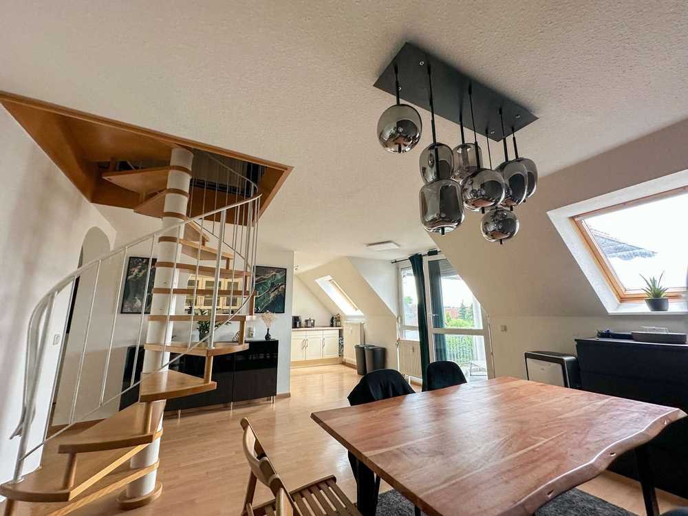 Die Wohnung überzeugt durch ihre helle Atmosphäre und einen vorteilhaft geschnittenen Grundriss. Sie geht über zwei Etagen, welche über eine elegante Wendeltreppe verbunden sind.