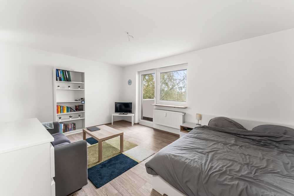 Der großzügige Wohn- und Schlafraum ist hell und freundlich gestaltet und bietet direkten Zugang zu einem geräumigen Balkon mit Blick ins Grüne – ein idealer Ort zum Entspannen. Die separate Küche ist mit einer modernen, neuwertigen Einbauküche ausgestattet. Das Badezimmer wurde im Zuge der