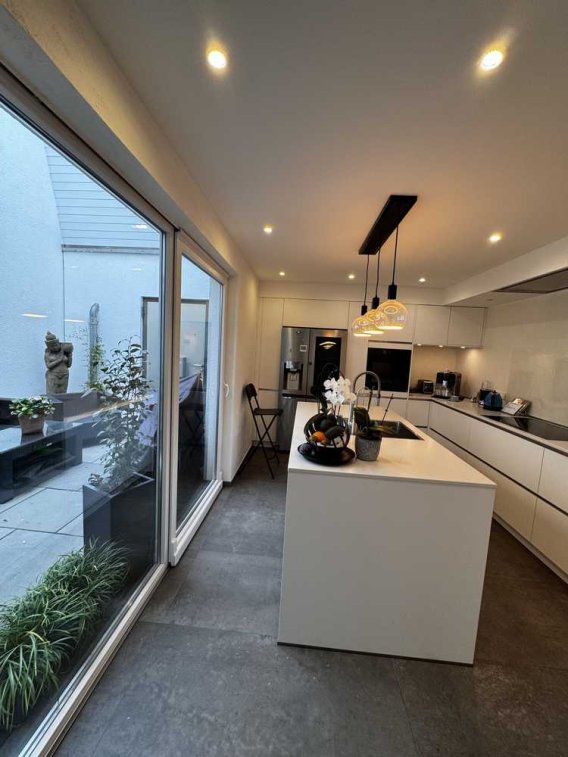 Hinter einer großen Wand versteckt befinden sich die Atriumhäuser. Der Eingang ist direkt an der Bruchhauser Straße. Sie kommen ins Atrium (kleiner Innenhof) und von dort zu dem Eingangsbereich des Hauses. Vom Flur aus gelangen sie in die großzügige Küche, mit hochwertiger EBK von 2021, wie auch ins Wohnzimmer. Ein Gäste-WC rundet das Erdgeschoss ab.
