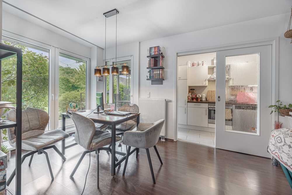 Das Herzstück der Wohnung ist das helle, geräumige Wohnzimmer mit bodentiefen Fenstern und Zugang zur Terrasse. Auch die separate Küche, die direkt an das Wohnzimmer grenzt, hat einen direkten Zugang zur Terrasse. Die moderne Einbauküche mit hellen Schränken und dunkler Arbeitsplatte ist durch eine große Schiebetür mit dem Essbereich im Wohnzimmer verbunden.
