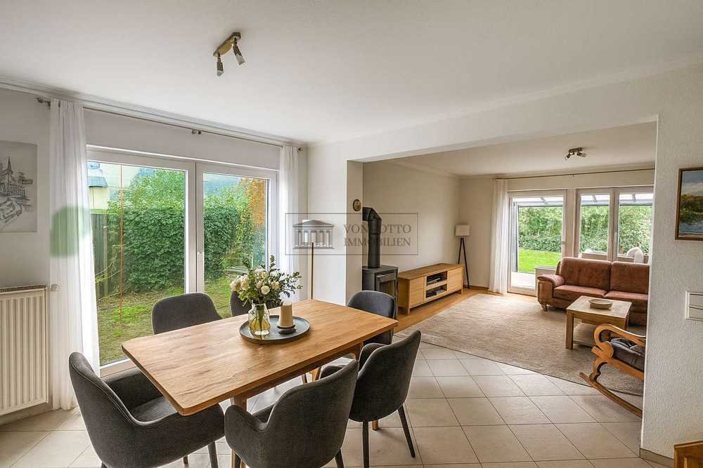 Vier Schlafzimmer schaffen Raum für Familie, Freunde oder das eigene Büro. Das großzügige Wohnzimmer mit direktem Zugang zur Terrasse ist der Mittelpunkt des Hauses – hell, offen, ein Ort zum Ankommen. Hier spielt das Leben: Frühstück in der Sonne, Kinderlachen im Garten, entspannte Abende mit einem Glas Wein im Freien.