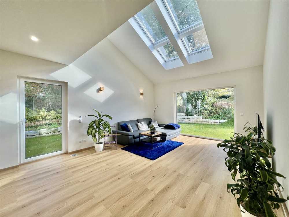 Der ebenerdige Eingangsbereich ist hell und freundlich und verspricht absolutes Wohlbefinden und Platz. Neben dem Duschbad lassen sich eine große Familiengarderobe und eine Sitzbank problemlos unterbringen. Links gelangen Sie in den offenen Wohn- /Ess- und Küchenbereich, das Herzstück der Immobilie und Treffpunkt für die ganze Familie. Hier wird bei modernstem Ambiente zusammen gekocht, gegessen, geredet und anschließend auf der Wohnlounge gechillt. Auch hier wurden ausschließlich bodentiefe Fenster verbaut, so dass dieser herrlich große Raum lichtdurchflutet ist. Besonders das große Fenster in den Himmel hinaus verzaubert mit seinem Ambiente und zieht nicht nur den Sternengucker in seinen Bann. Von hier aus haben Sie auch Zutritt auf die bereits erwähnte sehr große, nach Süden ausgerichtete Terrasse und den ebenerdigen Garten. Ebenfalls auf dieser Ebene befindet sich der Technikraum und eine praktische Speisekammer. In das Obergeschoss gelangen Sie über eine schöne Holztreppe mit integrierter Beleuchtung. Hier erwarten Sie drei Schlafzimmer, eine Ankleide, ein Büro sowie ein Tageslicht-Badezimmer. Für Ihre Fahrzeuge stehen Ihnen mehrere Stellplätze zur Verfügung. Darüberhinaus ist eine Baugenehmigung für eine Doppelgarage vorhanden.